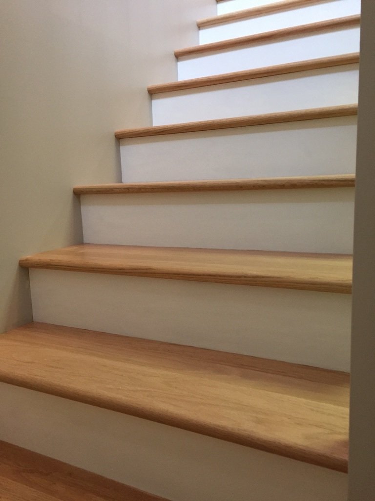 The risers in this case are oak plywood and the treads are solid oak. As you look at the two surfaces you can see the contrast. This is rotary cut veneer and is produced by turning the log against a knife. This provides the maximum amount of material but when installed side by side against cut board wood it can be jarring.