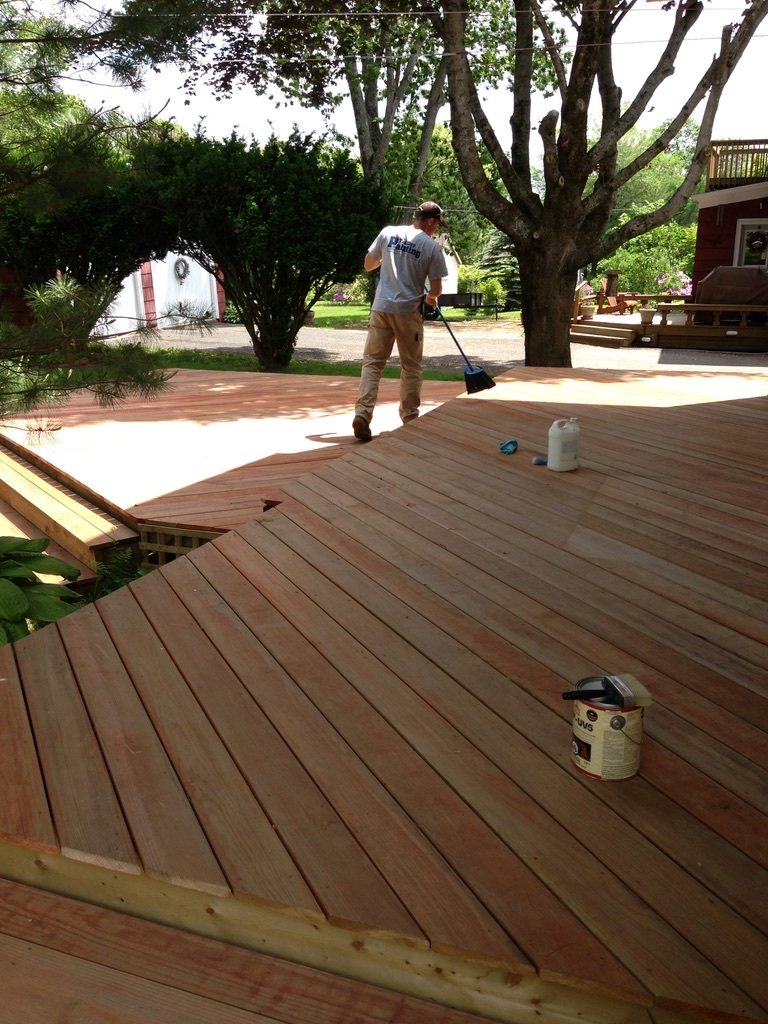 Leaves and what not swept off the surface before we apply the first of two coats of stain.